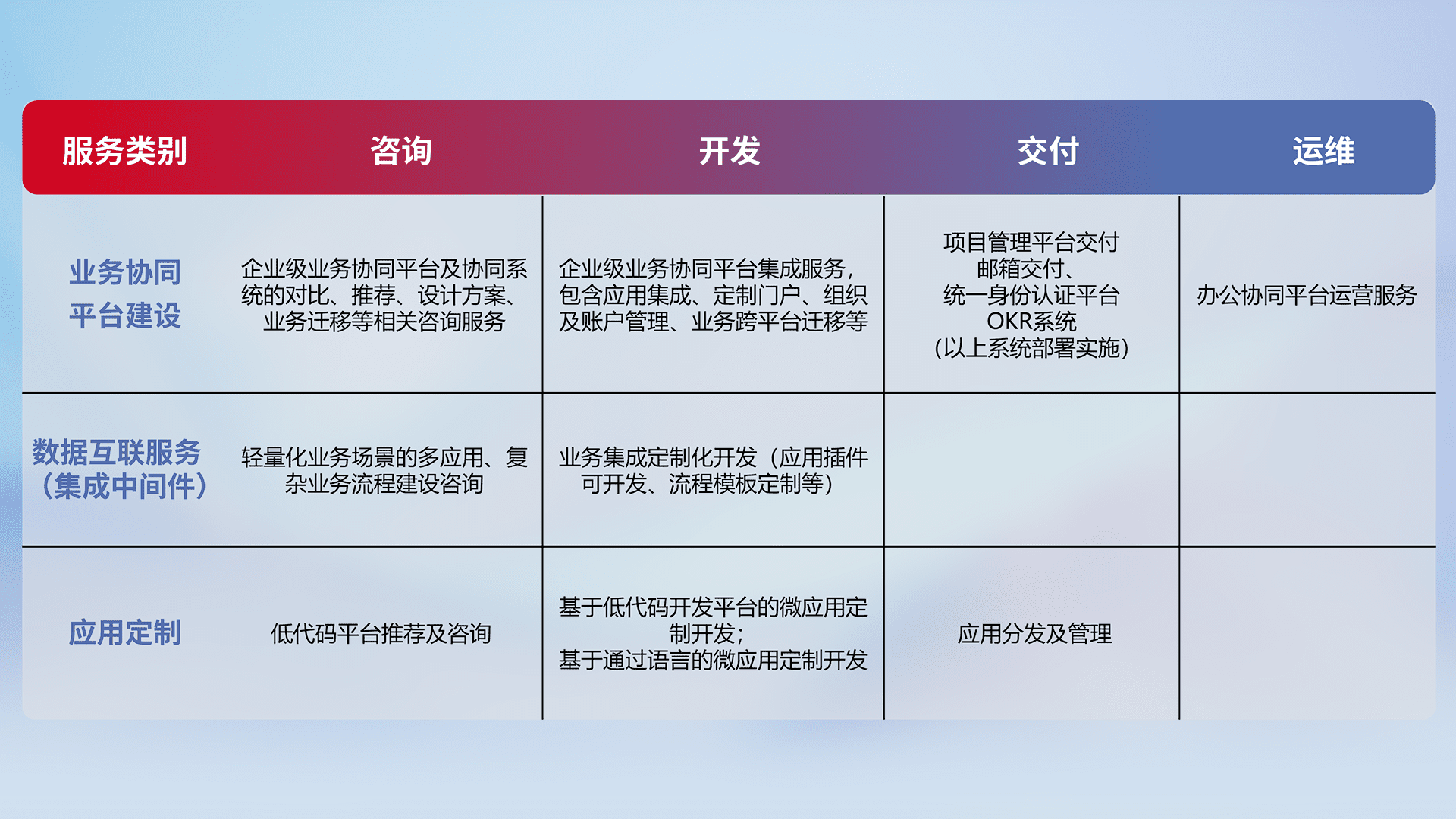 针对钉钉、、企微、、IDaas等平台级产品提供产品的规划、、、、方案、、交付、、定制化开发等服务,,,实现如统一协同办公、、智能客户服务、、混合会议管理、、、、智能数据查询、、、、等业务场景,,,,实现数字化转型。。。。