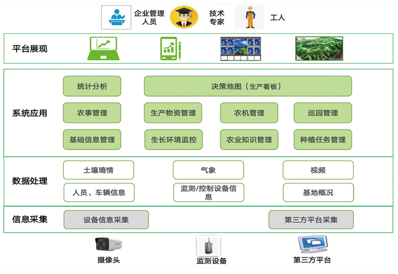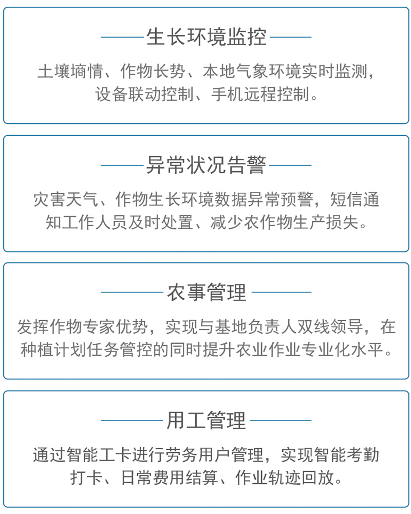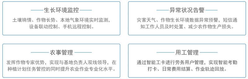 通过物联网、、大数据技术与农业生产经营相结合,,,为农业生产者和管理机构提供覆盖从业人员培养、、农机调度、、、、农产品生产与销售的全产业链智慧农业整体解决方案。。。。