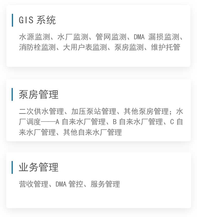 智慧水务一体化平台运用GIS+BIM、、监控感知、、、、数字化企业管理技术,,通过标准化、、、、精细化、、、、可视化施工管理,,实现投融资、、、建设管理、、、、运营管理一体化发展,,,,打破过去城乡之间、、、、城区之间、、、部门之间的管理壁垒,,,,消除水资源的信息隔阂,,实现从城市到乡镇、、从水源到水龙头的一体化、、、、数字化、、智慧化管控。。。通过整合云计算、、、大数据、、物联网技术,,,打造数字水务一体化平台,,,,实现水库、、、泵站、、、、水厂、、管网集中运维和客户服务、、、、商业营收、、、移动终端全水务业务集中管理,,并有机整合涉水部门职责、、、、及时分析处理涉水信息,,实现数据共享和交换,,,,形成全市水务物联网,,,,为数字城市建设奠定基础。。。